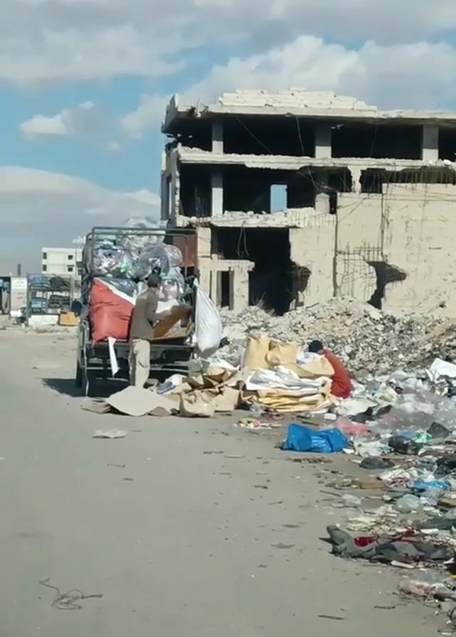 The video depicts a man loading items onto the back of a truck, in a setting marked by destruction and debris. The truck is already partially filled with large bags, some appearing to be filled with plastic bottles. The man is dressed in neutral-colored clothing. He is picking up cardboard and other objects from a pile on the ground and placing them onto the truck bed. The surrounding environment is strewn with trash and debris, suggesting an area affected by conflict or severe neglect. In the background, there is a partially destroyed building. The top floors are damaged, with exposed support structures and gaping holes in the facade. The sky is partly cloudy, and the overall scene conveys a sense of devastation and hardship.