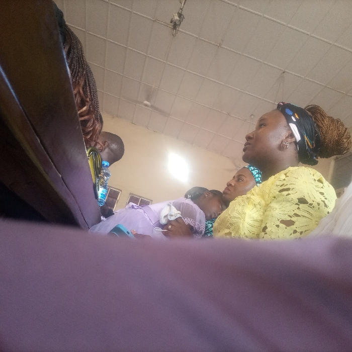 An indoor scene in Abuja, Nigeria, depicts several individuals seated in a room with a suspended grid ceiling. A white ceiling fan is visible towards the rear, along with a bright light source creating glare. In the left foreground, a person with braided hair is partially visible. Immediately to their right, a man with short hair, wearing a yellow and blue patterned shirt, holds a clear plastic water bottle. Adjacent to him, a young child in a light purple dress is asleep, resting on another person's lap or shoulder. A light blue smartphone lies near the child. A woman wearing a blue and green patterned headscarf is partially obscured behind the sleeping child. To the right, a woman in a yellow lace top and a patterned black headwrap with braided hair pulled back is looking upwards and to the right with an attentive expression. She wears an earring. The foreground features a blurred purple surface, indicating seating.