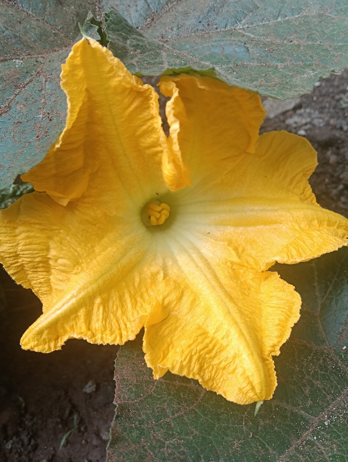 A close-up, top-down perspective captures a single, vibrant yellow flower, likely a squash or pumpkin blossom, occupying the majority of the frame. The flower features five distinct, undulating petals with ruffled edges, radiating from a central light yellow or whitish stamen/pistil structure. Sections of large, dark green leaves with visible veins and a rough texture are partially visible in the background, specifically in the upper-left, upper-right, and lower-right quadrants, positioned behind and partially beneath the flower. Dark brown soil is discernible in the lower-left corner, suggesting the flower is growing low to the ground. No people, active subjects, or specific interactions beyond the natural plant growth are present. The environmental context is natural, indicating an outdoor setting. The specific location within the city of Nairobi, Kenya, cannot be determined from the visual information provided.