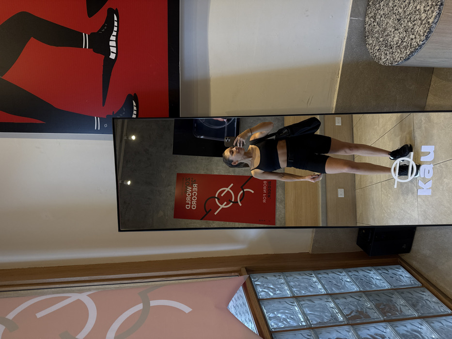 The image displays a full-length mirror selfie taken by an adult female within a Kau Training facility located in San Pedro Garza García, Mexico