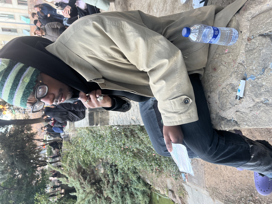 A person sits on a stone ledge in an outdoor setting. They wear a tan coat, black hoodie, green and white striped hat, and glasses. They hold a folded paper in their right hand. A water bottle and a lighter rest on the ledge beside them. Other people and trees are visible in the background. The person wears blue Crocs.