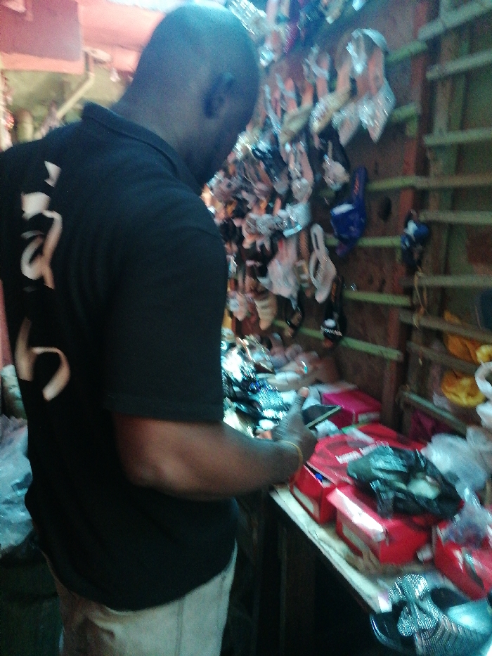 A man with a shaved head stands at a shoe stall. He wears a dark shirt with light-colored pants. Shelves behind the counter display an assortment of shoes. Red shoeboxes are visible on the counter, with some shoes placed on top. The man's right hand holds a cell phone, and a gold bracelet adorns his wrist. The area appears to be a crowded marketplace.