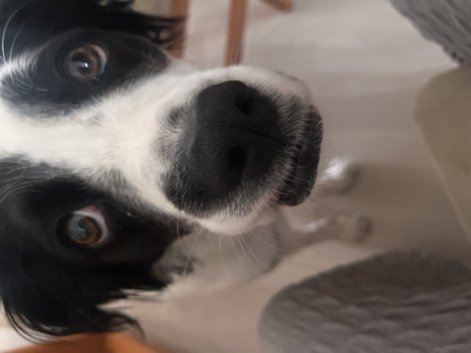 - "The image depicts a close-up, eye-level perspective of a black and white domestic dog" by FM-9WHfb2, licensed under CC BY 4.0