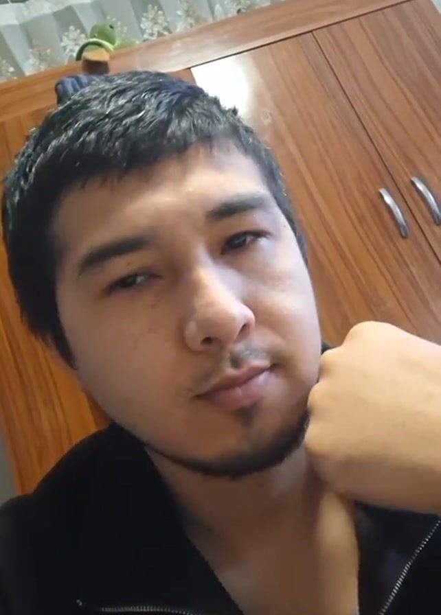 A close-up shot shows a man with short dark hair, a thin goatee, and dark eyes, wearing a black zip-up jacket. His right hand is resting on his chin. He briefly touches his hair on his forehead. Behind him is a wooden cabinet with metal handles and a white curtain with a floral pattern at the top of the frame. A small green stuffed toy sits atop the cabinet. The camera angle is slightly tilted upward.