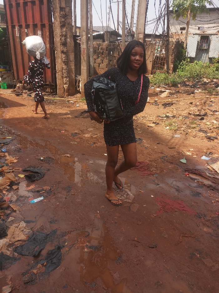 Two women navigate a muddy, littered street. One carries a white sack atop her head, wearing a patterned dress. The other, facing the camera, carries a black bag and wears a short, dark, shimmering dress. Both wear sandals. Overhead power lines crisscross the scene, and buildings are visible in the background. The ground is covered in puddles, garbage, and patches of red discoloration. A red shipping container stands to the left of the frame.