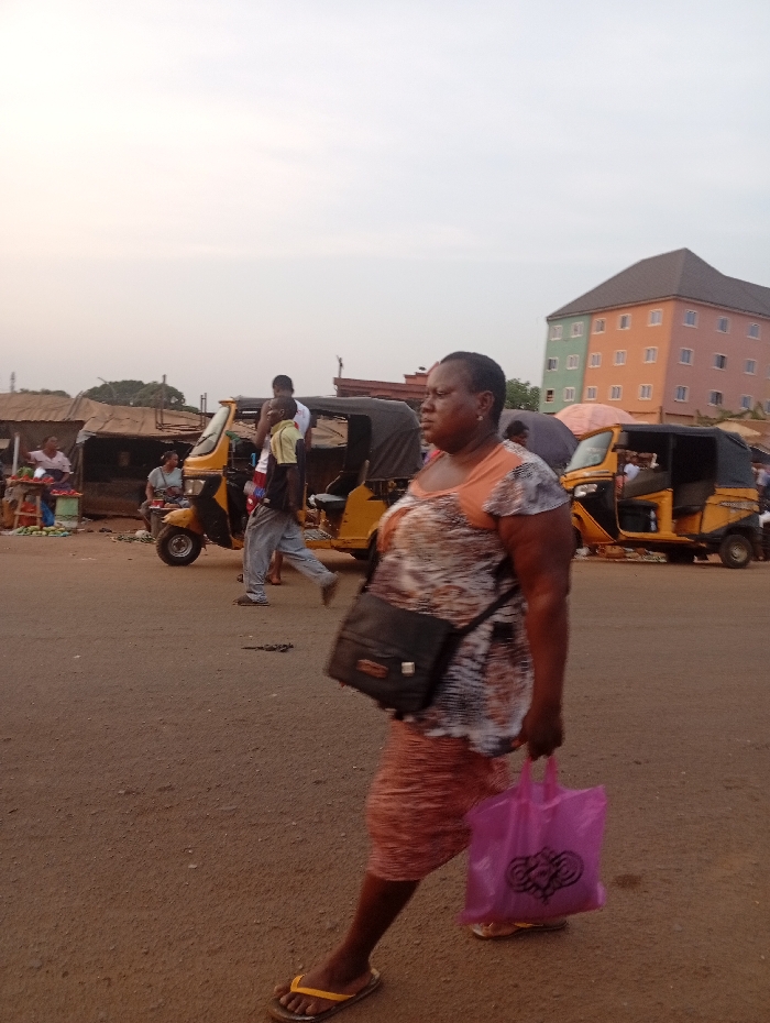 In an outdoor setting, a woman with a black shoulder bag and pink plastic shopping bag walks towards the viewer. She wears a patterned top, reddish skirt, and yellow sandals. Behind her are yellow three-wheeled vehicles and several people. Stalls with brown rooftops can be seen on the left side of the image. A multi-story building with pink and green walls stands in the background under a hazy sky. The ground appears to be dirt or packed soil.