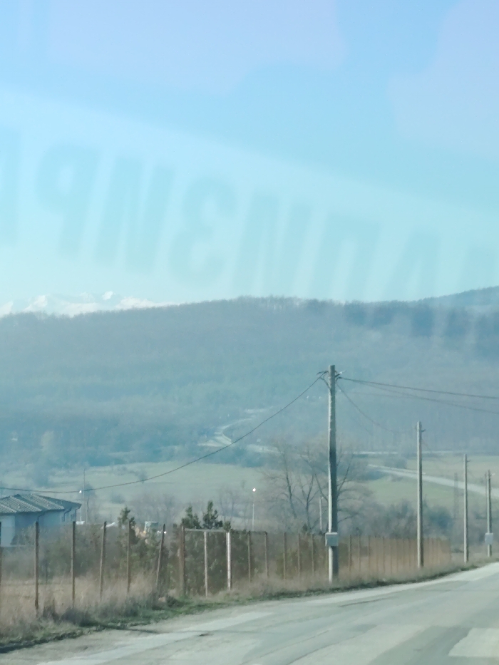 The image depicts an outdoor scene in the city of Baliovtsi, Bulgaria, captured likely from inside a vehicle. The foreground features an asphalt road with faint, light-colored markings along its surface, extending towards the lower right. Parallel to the road on the left, a weathered brown fence with numerous vertical posts separates the road from a patch of overgrown, dry grass and scattered small evergreen shrubs. A series of approximately five concrete utility poles, equipped with multiple overhead wires, extends diagonally from the mid-right foreground into the distance, receding in scale. In the midground, beyond the fence and utility poles, a light-colored, single-story building with a dark grey roof is visible on the far left. The terrain consists of rolling hills covered with a mix of sparse, bare deciduous trees and dry grassy areas. A winding, light-colored road or path is discernible traversing these hills. Several faint light sources, consistent with streetlights, are scattered across the midground. The background is dominated by a range of hazy, tree-covered hills and mountains. The highest peaks in the distance exhibit patches of white, suggesting snow or bright rock formations, against a clear, light blue sky that gradually lightens towards the horizon. A faint, mirrored reflection of Cyrillic text, appearing reversed as "Я З М Ǝ И Я П" or similar characters, is visible diagonally across the upper sky portion of the image, indicating capture through glass. No individuals or animals are present in the scene.
