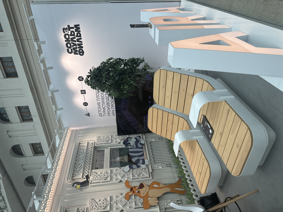 n indoor exhibit in the city of Moskva, Russia, located at 55.754 latitude and 37.627 longitude. Two white lounge chairs with wooden slats are positioned in front of a white wall with the words "СОЮЗ МУЛЬТ ФИЛЬМ" in black text. The chairs are angled slightly towards each other. A smaller black lounge chair sits to the left, empty. On the white wall, a sign in Russian advertises a "Детские Площади" or "Children's Square." In front of the wall and the chairs is a large white display with "AIRA" in large white, glowing letters. A potted plant with green leaves sits on the floor in front of the wall. A black notebook computer sits on the right lounge chair's wooden slat. There is a black bird figurine on the white wall behind the chairs.