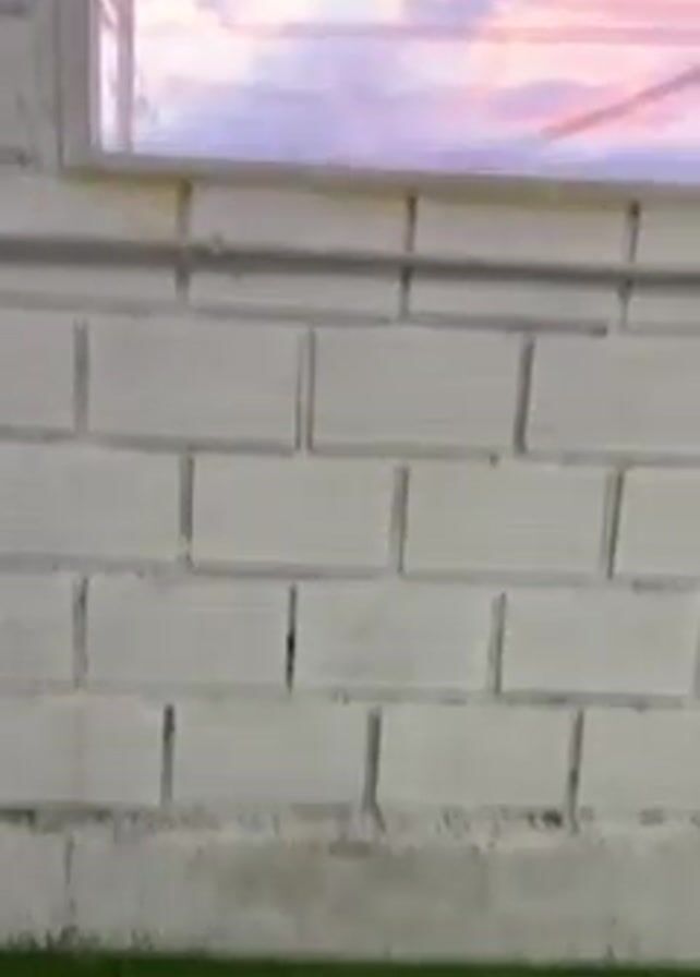 The camera pans up a white brick wall, past a base of slightly darker concrete, and green turf at the bottom