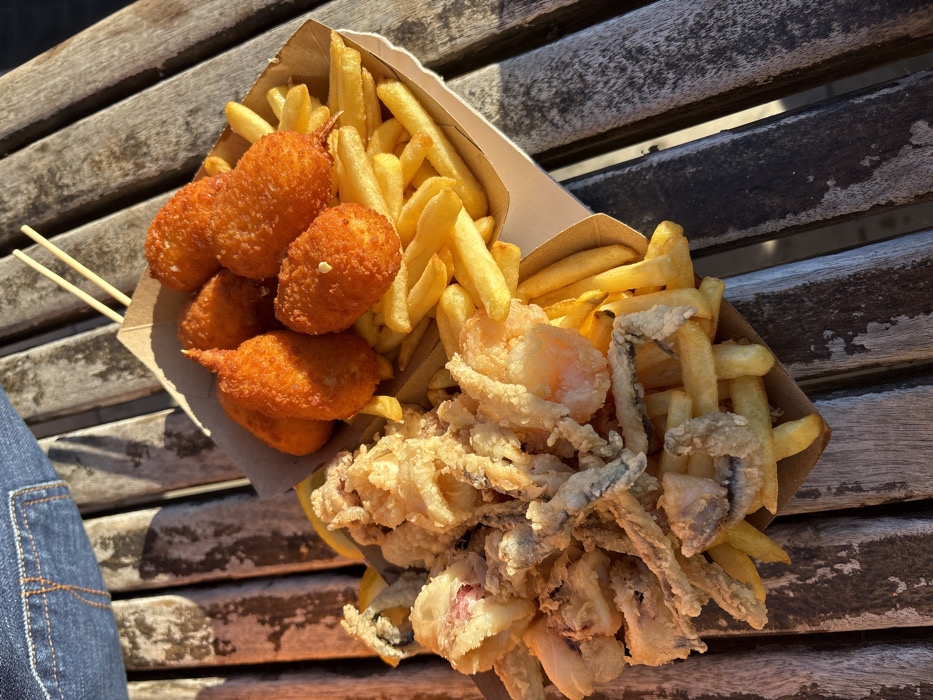 - "Two open, disposable paper cartons containing fried food are positioned on a weathered, slatted wooden surface outdoors in Monterosso al Mare, Italy" by FM-E1hwL2, licensed under CC BY 4.0