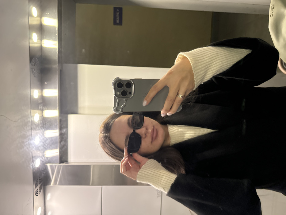 A female subject is depicted taking a selfie in a reflective indoor environment, identified as being in Akulovo (Gp Kubinka), Russia. The subject, with shoulder-length dark brown hair, wears a cream-colored ribbed turtleneck sweater under an open dark coat. She holds a smartphone with a gray, irregularly shaped case in her left hand, angled towards herself. Her right hand adjusts a pair of dark, rectangular-framed sunglasses, which are positioned partially down her nose. A thin band ring is visible on the ring finger of her left hand. The background consists of highly reflective wall panels, consistent with an elevator interior or mirrored hallway. Overhead, multiple recessed light fixtures illuminate the space. Reflections of a dark blue sign displaying "MATE P" and a light-colored object with "OLEX" text are visible on the reflective surfaces.