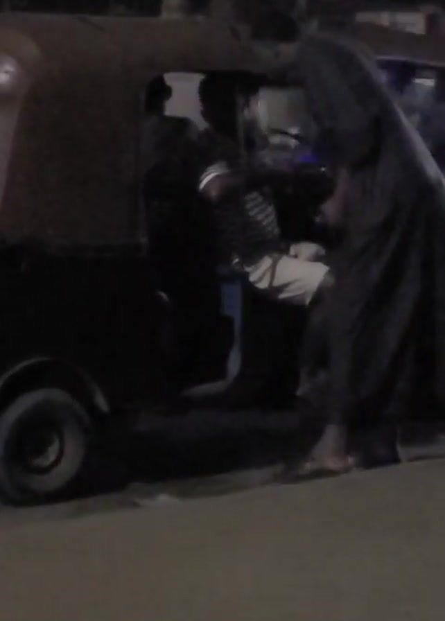 The video depicts a dimly lit street scene at night. An auto-rickshaw sits stationary, with a person visible inside. Standing beside the vehicle is another individual dressed in a dark robe or garment. The person in the robe appears to be interacting with someone inside the auto-rickshaw. The setting seems urban, with other people visible in the background near buildings or structures. The video quality is poor, affecting visibility and clarity.