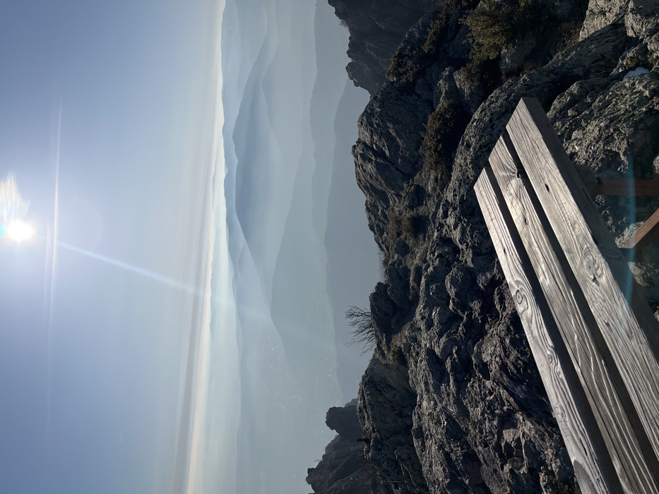 The image displays a panoramic mountain vista, located in the vicinity of Ichera, Bulgaria. The upper third of the frame shows a clear blue sky, dominated by a bright sun at the upper center, which produces a prominent lens flare extending diagonally downwards. A faint, elongated cloud band is visible on the left side of the horizon. Below the horizon, successive layers of mountains and hills recede into the distance, appearing progressively hazy and desaturated in blue-grey tones due to atmospheric perspective. A valley containing a visible settlement is situated in the central mid-ground, partially obscured by atmospheric haze. The foreground and immediate mid-ground are characterized by rugged, dark grey rock formations with fractured surfaces, interspersed with sparse, dry, low-lying vegetation, including a single bare shrub. Small patches of snow are observable in some rock crevices. No individuals are present. A weathered wooden bench, composed of three visible planks with distinct wood grain, occupies the lower right quarter of the frame, positioned to overlook the extensive landscape.