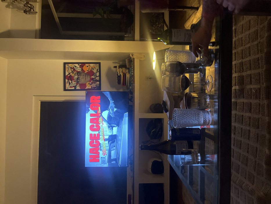 A TV displaying "Hace Calor" is mounted on a wall with shelving. Above the TV is framed art. A coffee table in front of the TV is covered with various glassware including wine glasses and tumblers, along with a wine bottle. An arm and hand of a person are visible at the upper right of the frame, and the top of a rug is visible to the right of the table. The room is lit with warm light.