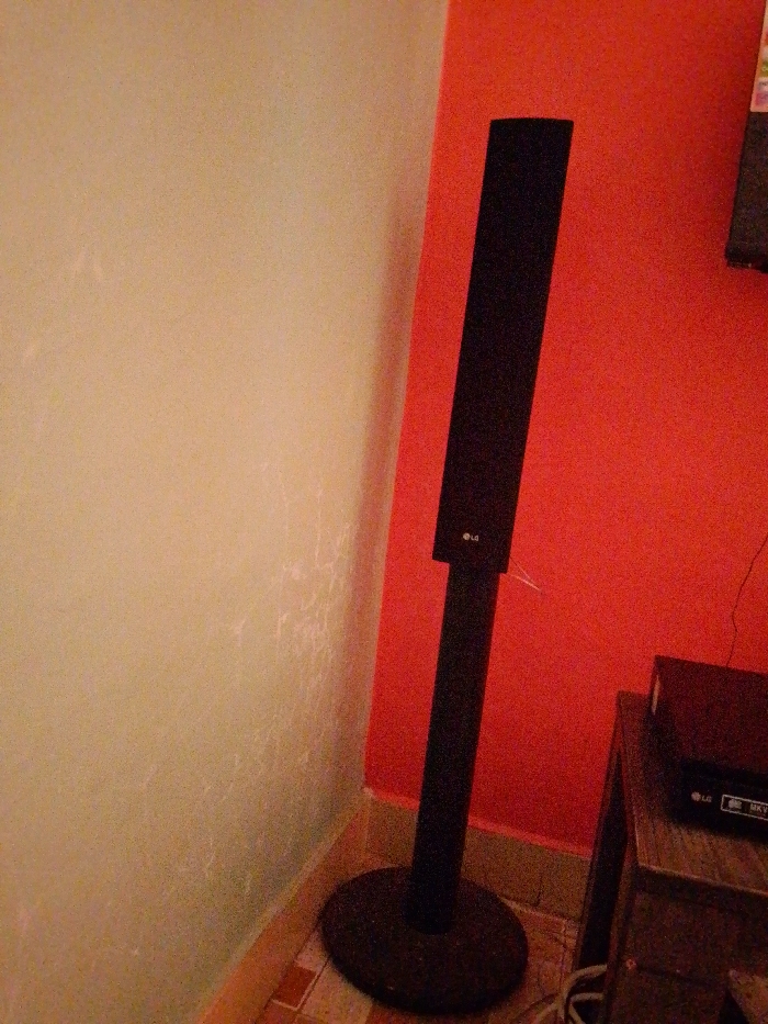 The scene depicts an indoor corner within a room, located in Limuru Central ward, Kenya. No individuals are present. The left wall is painted a light beige or off-white color and exhibits a textured surface with some lighter, irregular streaks or marks. The right wall is painted a solid red or orange and also shows a textured appearance. These two walls meet at an interior corner. A tall, black LG brand tower speaker with a circular base is positioned on the floor directly in the corner. The LG logo is visible on the upper section of the speaker's main unit. A thin, light-colored wire or cable is seen extending horizontally from the speaker towards the right wall. The floor consists of square tiles laid in a diagonal pattern, primarily featuring light brown/orange and possibly darker shades near the corner. A light-colored baseboard separates the walls from the floor. To the right of the speaker, a dark, possibly wooden, entertainment unit or cabinet is partially visible. On its top surface, a black electronic device, identified by an LG logo and "MKV" text, is situated. This device appears to be a media player, likely a DVD or Blu-ray player. Multiple white cables are visible on the floor in front of and around the base of the entertainment unit and speaker. No actions or interactions are depicted. The lighting appears to be ambient indoor light, contributing to a slight graininess in the image.