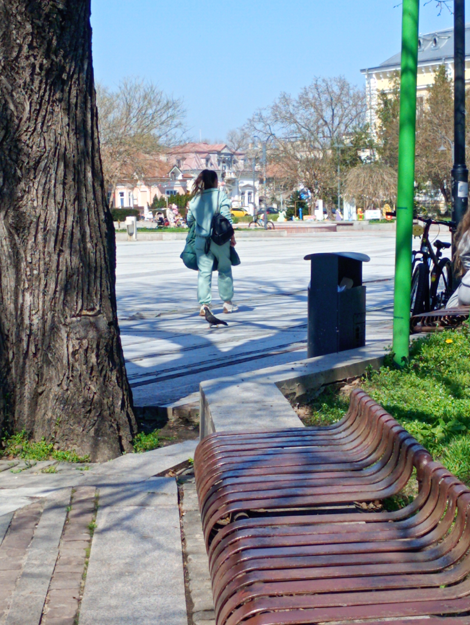 public square in Alfatar, Bulgaria. In the foreground is a brown bench with curved metal slats. Adjacent to the bench is a green pole, a black trash receptacle, and a tree trunk. A young woman is walking away from the viewer, across the paved square, towards buildings in the distance. A bird is on the ground near the woman. Other people are in the background. The sky is blue.
