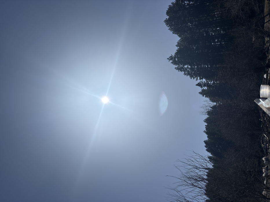The image depicts an outdoor scene in Grohotno, Bulgaria, under a clear, bright sky. The upper two-thirds of the frame consist of a light blue, cloudless sky. The sun, a brilliant white point of light, is positioned in the upper center-right, generating prominent lens flares, including a distinct elliptical flare located below the sun. The lower third of the image shows a dark tree line and foreground. The right side features a dense concentration of coniferous trees, while the left side exhibits deciduous trees with bare branches. The immediate foreground, particularly towards the bottom right, reveals fragmented, translucent or reflective objects, possibly plastic or glass, catching direct sunlight. Further to the left in the foreground, an indistinct pile of light-colored debris is visible. No individuals are present in the scene.