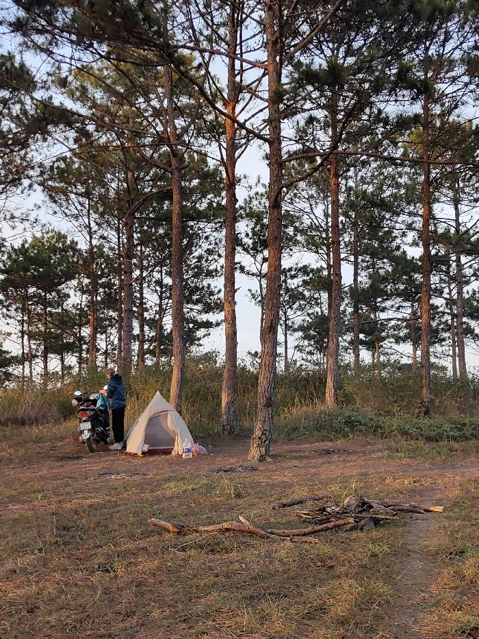 The image displays a solitary campsite located within a pine forest, characteristic of the highlands in the vicinity of Thành phố Đà Lạt, Vietnam