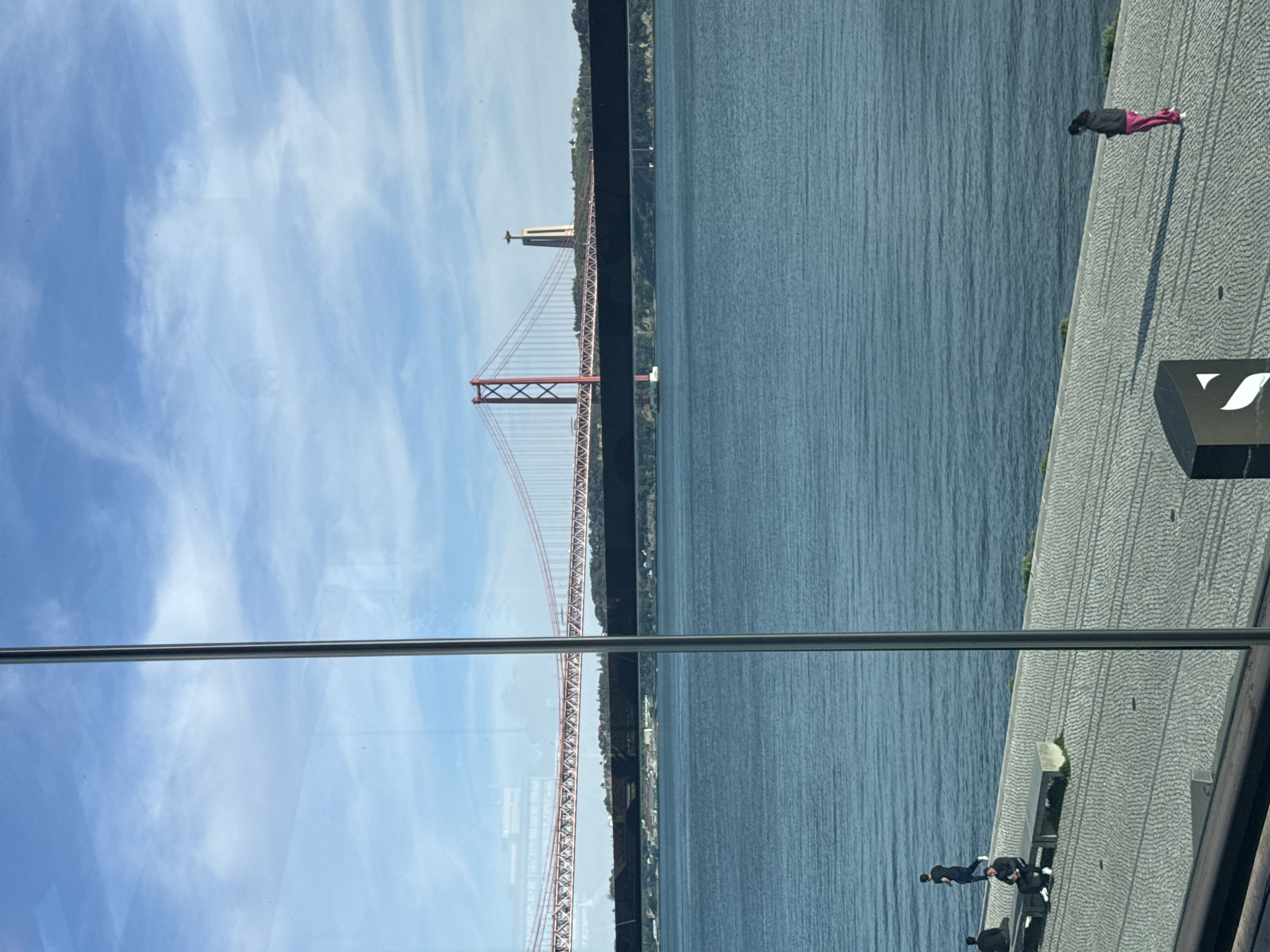 Ponte 25 de Abril bridge in Lisbon, Portugal, seen through a glass panel. The bridge spans a body of water, with a coastline visible along its length. The sky is blue with scattered clouds. On the right side of the image, a paved area is visible with several people, including a person lying down. There is a modern-style bench or structure with a logo. A thin metal bar runs horizontally across the center of the frame, partially obscuring the view.