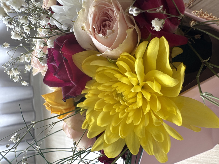 The image displays a close-up, elevated view of a floral arrangement. The precise location within Varna, Bulgaria, cannot be determined from the visual information. The bouquet contains a large, prominent yellow chrysanthemum positioned centrally, surrounded by several roses in shades of pink, red, and yellow. Interspersed among these are smaller white chrysanthemums and delicate white gypsophila (baby's breath). The flowers are contained within a light pink or peach-colored, angular wrapping or box, partially visible at the bottom and left. The background is out of focus, depicting an indoor setting with diffused light from a window, behind which light-colored curtains or blinds are present. No individuals, actions, or interactions are visible.