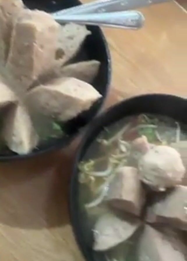 two bowls of what appears to be meatball soup, likely an Indonesian dish called Bakso. The bowls are black and placed on a wooden table, next to bottles of condiments and a water bottle. The meatballs are arranged in a flower-like pattern in each bowl. Each bowl also contains noodles and bean sprouts. A pair of metal spoons is placed on top of the soup in one of the bowls. Someone is speaking in the background.