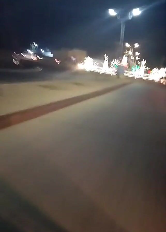 road at night, possibly from a moving vehicle. The road surface is light gray. On the side of the road, there are lighted decorations that look like Christmas decorations. There are also streetlights in the background. The overall lighting is dim but sufficient to see the road and decorations. The camera seems to be moving forward. The video includes a watermark for a Tecno Spark 10c phone.