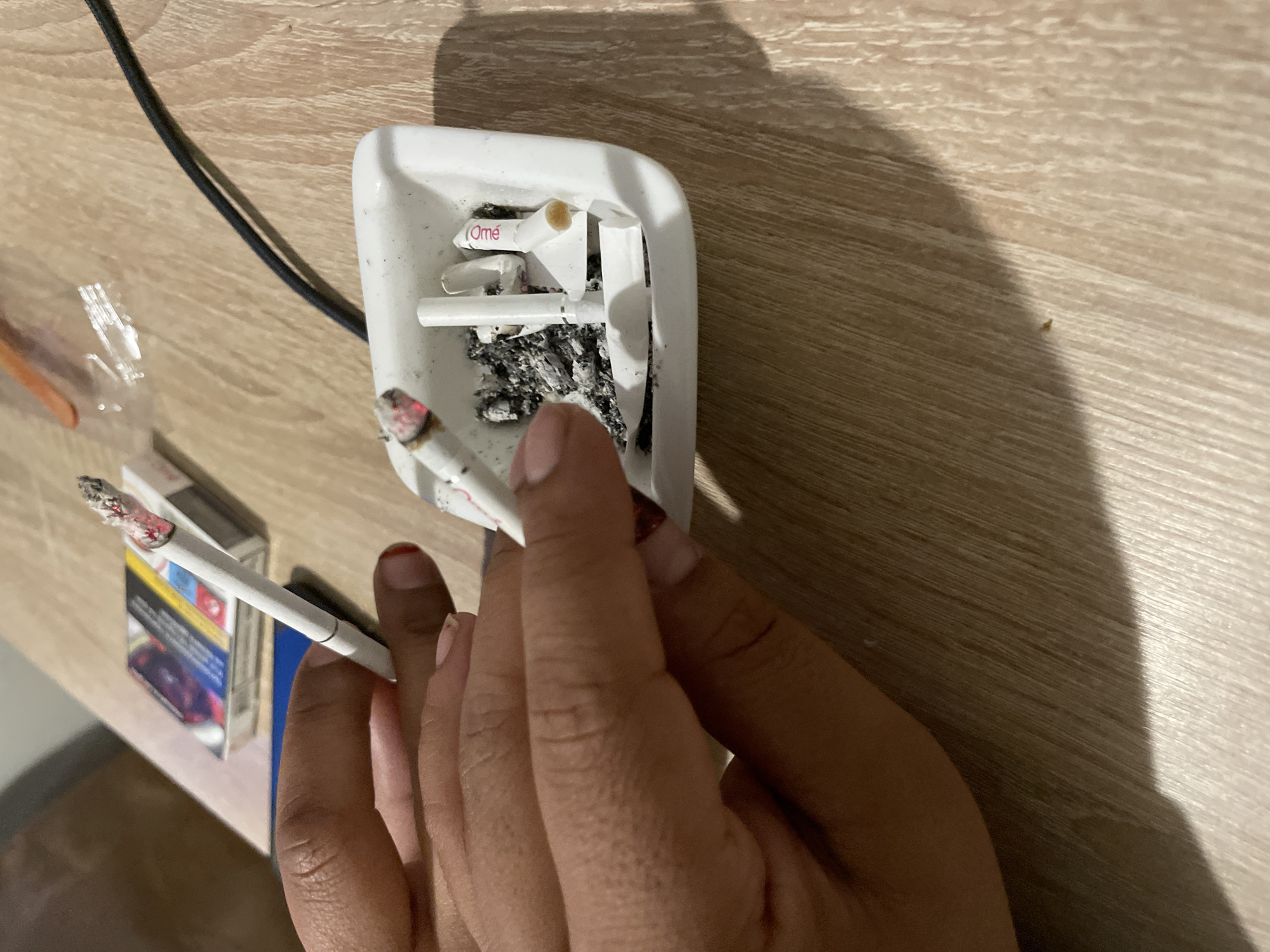 A close-up image displays a human hand holding an actively burning cigarette, positioned above a white rectangular ashtray. The hand features medium brown skin pigmentation and manicured nails, some with red polish and others with light pink. The cigarette held by the hand exhibits a glowing red ember and a column of white ash. The ashtray, made of white material, contains several discarded cigarette butts and accumulated ash; one visible filter fragment is marked with 'Omé' branding. The scene is set on a light-colored, wood-grain surface. In the background, partially out of focus, rests a multi-colored cigarette pack with prominent health warnings, positioned on a blue item. A black electrical cable traverses the surface, near which a small, clear, irregular plastic fragment is observed. A portion of an orange object is visible in the upper background. This scene is located in Dronten, Netherlands.
