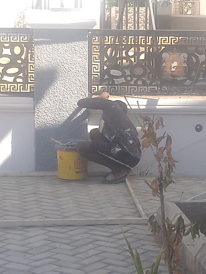 In Kwang, Nigeria, an outdoor scene depicts a male individual squatting to perform maintenance work on a textured grey wall or pillar. The person is dressed in dark attire, including a long-sleeved shirt stained with light-colored paint, dark trousers or shorts, and light-colored flip-flops. Their right hand is raised, holding a tool consistent with a paintbrush or roller, directed towards the wall. To the immediate left of the individual is a yellow paint bucket with a grey lid, containing a brush handle. The ground is paved with light grey interlocking pavers arranged in a herringbone pattern. Above the wall section, a dark metal railing or fence features intricate decorative patterns, including Greek key motifs and interconnected circles and ovals. A distinct shadow is cast across the textured wall from the left, suggesting bright sunlight. In the lower right foreground, a small, mostly desiccated plant with brown leaves stands beside the paved area.