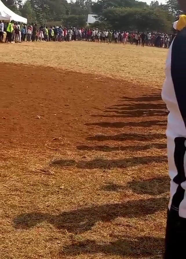 A wide shot shows a track and field event. Runners are competing in a race, moving away from the camera toward a crowd of spectators behind a white tent. The track is divided into sections of red dirt and dry brown grass. Trees surround the field. A person in a black-and-white striped shirt stands to the right of the frame, partially obscuring the view. Shadows of the observer stretch across the field.