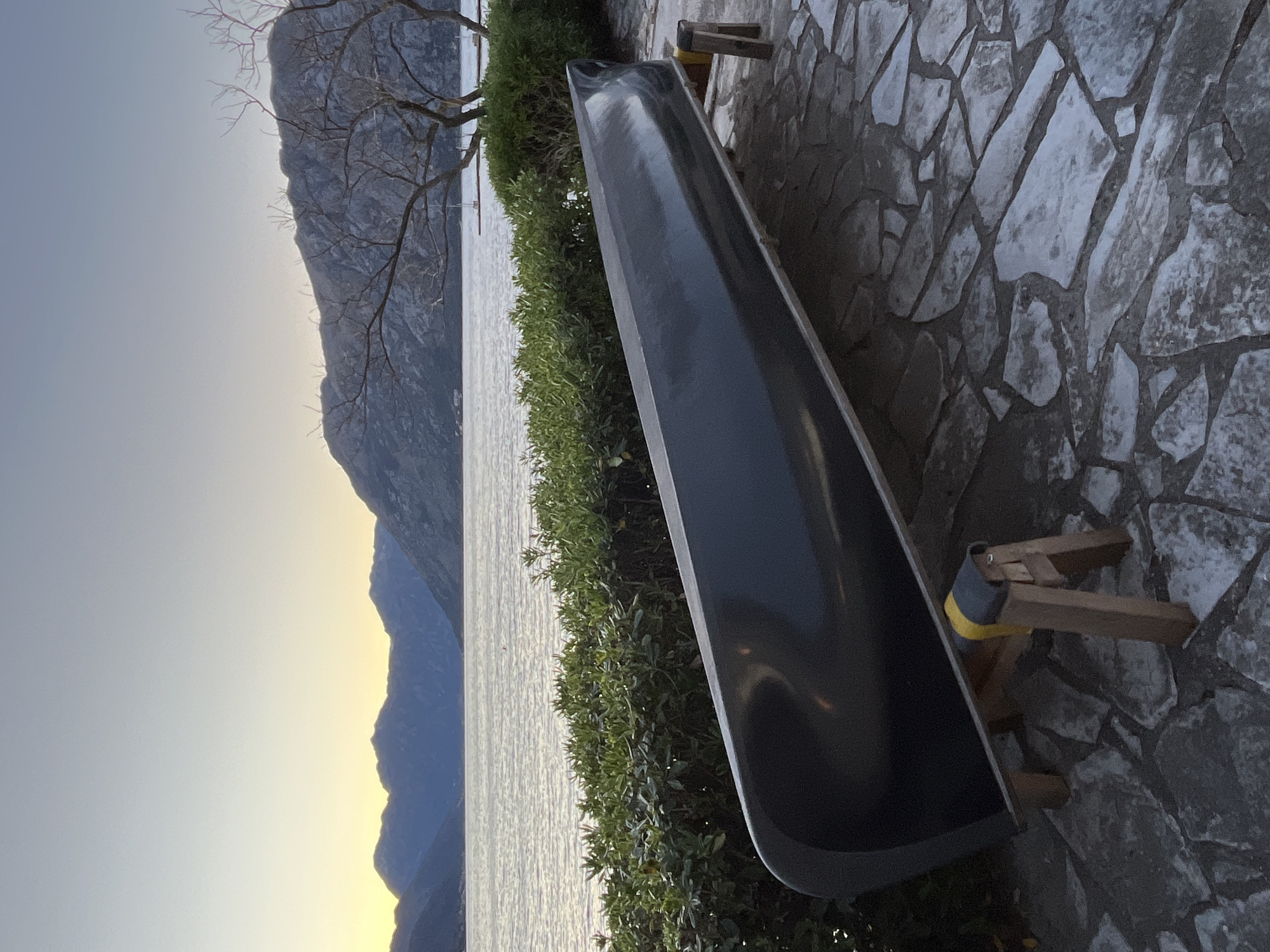 A horizontally-oriented photograph captures a canoe resting on two wooden supports against a background of a waterfront view, likely taken in or around Dobrota, Montenegro. The foreground shows a dark-colored canoe with a smooth, reflective surface, supported by two light brown wooden structures with yellow accents near the top. These structures appear to be custom-made supports for the canoe. The canoe and its supports are situated on a stone-paved surface, which makes up the lower right part of the frame. Behind the canoe is a dense green hedge or line of bushes, separating it from the water. The waterfront view includes a body of water that appears calm and reflective. In the distance are mountain ranges; the peaks are silhouetted against a soft gradient of light at the horizon, ranging from yellow to a pale blue sky. The sky is clear, with the light suggesting either sunrise or sunset. To the left, a bare tree with slender branches stands against the mountain backdrop, adding a natural element to the composition. No people are visible in the shot.