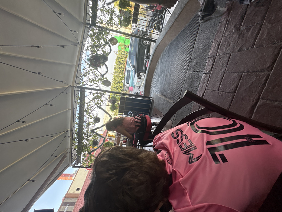 Under a white awning decorated with foliage and lights, the edge of an outdoor patio is seen. The stone floor gives way to a street view. A person in a pink shirt that reads "MESSI 10" sits with their back to the camera, and another individual is visible in the background seated at a high-top table, facing away.