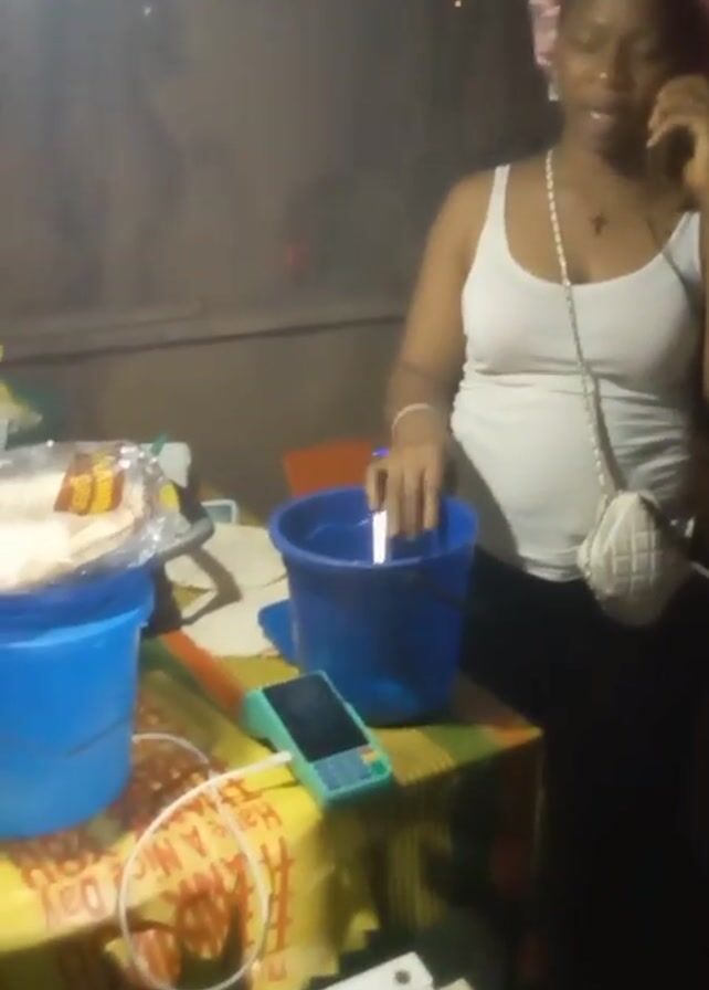 A woman is standing behind a table. She is wearing a white tank top, black pants, and a pink head covering. A necklace and a small white quilted purse with a long strap are also visible. She is talking on a cell phone and holding a blue bucket. On the table are several items, including a POS device, another blue bucket, a pack of food wrapped in plastic, and other objects obscured by the angle and low light. The table is covered with a yellow tablecloth with a repeating red and green pattern. She walks away from the table carrying the bucket. The lighting is poor, and the background is dark and cluttered.