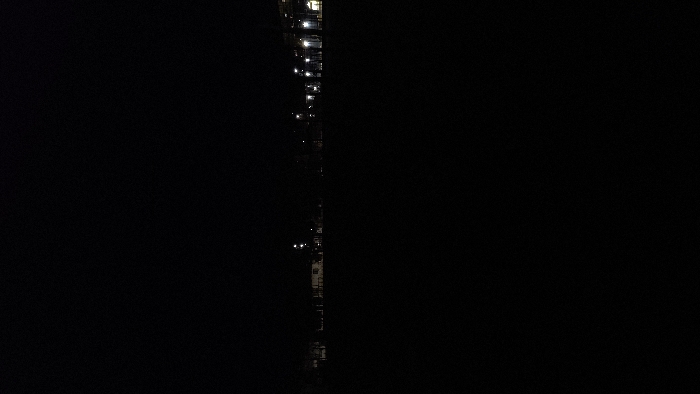 The image depicts an outdoor night scene in Kavarna, Bulgaria. The lower two-thirds of the frame are uniformly dark and featureless, indicative of an unlit open area. Along the upper portion of the frame, a horizontal band of artificial light sources marks a distant urban or suburban area. Multiple streetlights are visible, emitting white or yellowish light. Towards the left of this illuminated band, a light-colored, low-rise building is faintly discernible amidst darker, indistinct structures and the silhouettes of trees or tall vegetation against the dark sky. No individuals or specific actions are identifiable within the scene.