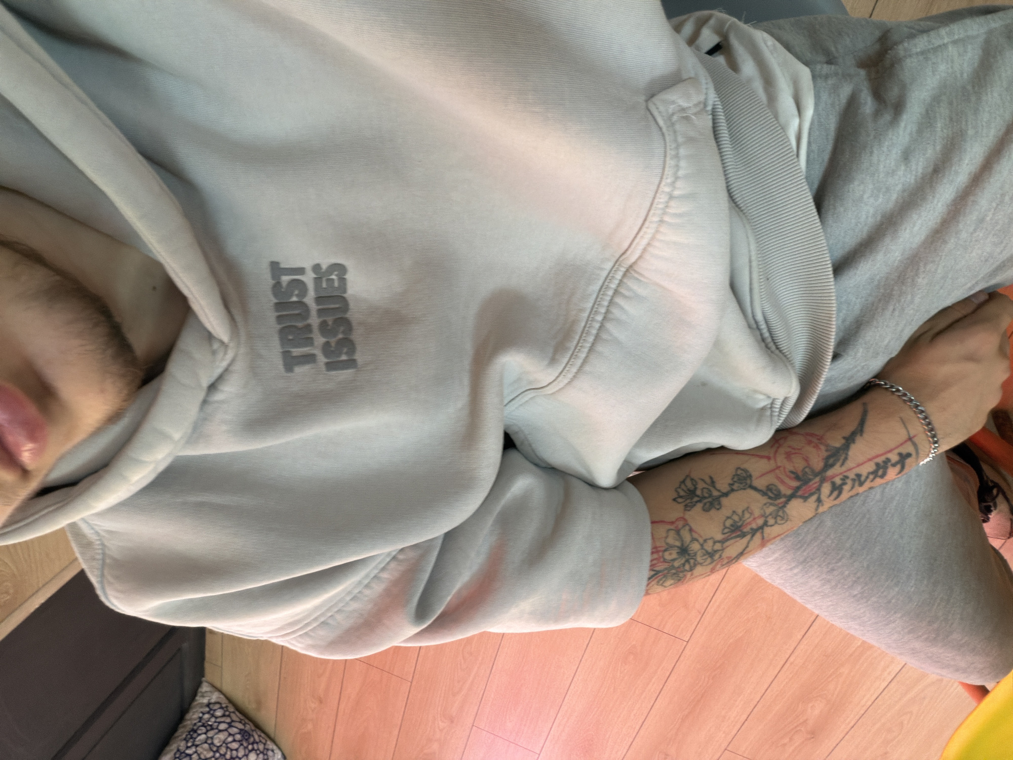 A person is wearing a light gray hoodie with the words "TRUST ISSUES" printed on the chest. They are also wearing gray sweatpants. The person has a tattoo on their forearm, which includes cherry blossoms and Japanese characters. The background is a wooden floor. The location is not specified in the image and cannot be assumed.