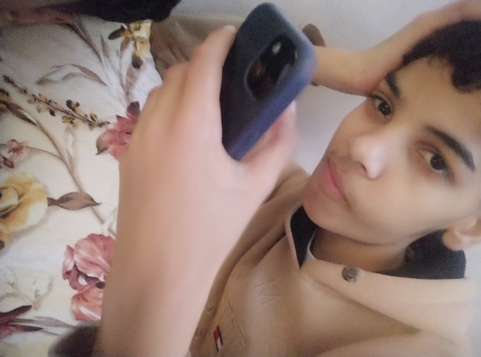 A young individual is depicted in an indoor setting, identified as being in the city of Fez, Morocco. The subject has short, dark, curly hair and dark eyes, looking directly at the camera. They are wearing a beige hooded sweatshirt with a visible black collar and a small red, white, and blue flag-like logo on the lower right side. The subject's left hand supports their head, resting against a plain light-colored background. The right hand holds a dark blue smartphone in the foreground, with its multi-lens rear camera module clearly visible. Beneath the right arm and the phone, a floral-patterned fabric, featuring pink and yellow flowers with green and brown leaves on a light background, is visible, indicating a cushion or bedding.