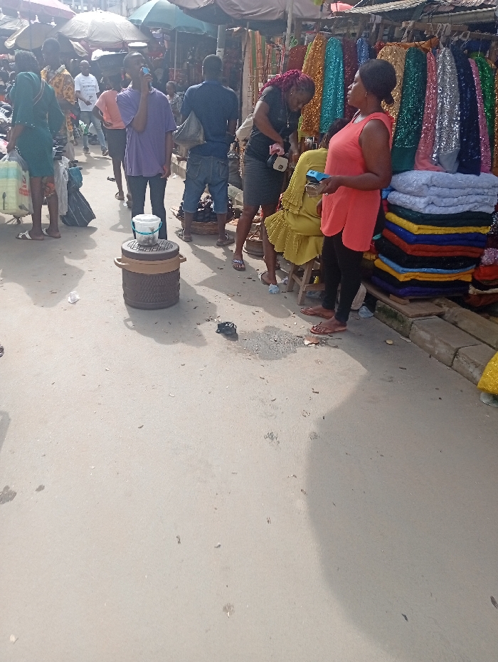 The image depicts a bustling outdoor market scene in the city of Nkwelle, Nigeria. The concrete ground in the foreground is soiled with debris and shadows. Centrally, a brown cylindrical container with a white lid sits on the pavement, holding smaller white objects. In the midground, a man in a purple short-sleeved shirt is speaking into a black handheld device, positioned at his mouth. To his immediate left, a woman in a dark green dress carries a yellow plastic bag and stands barefoot. Further right, a man in a dark blue short-sleeved shirt and denim shorts is seen from behind, carrying a dark bag over his shoulder. Adjacent to him, a woman with reddish-pink hair, wearing a black top and dark skirt, leans forward while holding a small dark object, interacting with a partially visible individual in a yellow garment seated on a small wooden stool. To her right, a woman in a coral-orange sleeveless top and black leggings stands barefoot, holding several banknotes and a blue rectangular object. Behind these individuals, a market stall displays numerous vertical strips of sequined fabrics in various colors (gold, blue, green, silver, red, purple), hanging from a rack. Below these, stacks of neatly folded textiles in solid colors (white, yellow, green, blue, black, red) are arranged. The background reveals additional market stalls with awnings and numerous indistinct people, indicating a crowded commercial environment under daylight conditions.