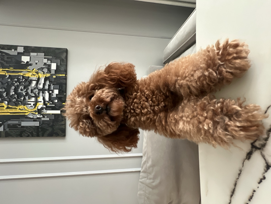 - "A reddish-brown poodle-type dog is positioned upright, resting its front paws on a white surface with dark, irregular veining patterns, consistent with marble" by FM-EuH2L2, licensed under CC BY 4.0