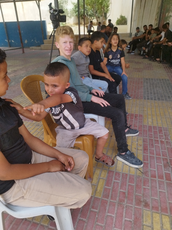 This image depicts an outdoor gathering in Idhna, Palestinian Territory, under a light-colored shaded structure supported by metal poles. The ground is paved with rectangular bricks in alternating red-brown and yellow patterns. In the foreground, six individuals, primarily children and adolescents, are seated in a row on plastic chairs. From left to right: 1. A male, visible from the torso down, wearing a dark shirt and light-colored pants, seated on a white chair. 2. A young boy with a short haircut, wearing a dark striped t-shirt and light shorts, is seated on a yellow chair, his left foot clad in a brown sandal. He is leaning slightly right, with his right hand on the shoulder of the adjacent individual, and his left arm extended, pointing his index finger to the left. 3. A fair-haired male adolescent in a green hooded top and black pants, seated on a white chair. He is looking directly at the camera and smiling. The young boy from position 2 is partially on his lap. 4. A boy with dark hair, wearing a light gray long-sleeved shirt and light blue jeans, seated on a white chair, looking towards the right. 5. A boy with dark hair, wearing a black t-shirt and dark pants, seated on a white chair, looking towards the right. 6. A girl with long dark hair, wearing a dark blue Real Madrid jersey and blue jeans, seated on a white chair, looking towards the right with her eyes closed or cast downwards. In the mid-ground, slightly to the left and behind the seated group, a black video camera is mounted on a tripod. In the background to the right, approximately 10-15 additional individuals, mainly males of various ages, are seated or standing, appearing to observe something out of frame. A blue wall is visible in the distant background to the left, with some green foliage and structures beyond the immediate shaded area. The scene is illuminated by natural daylight.