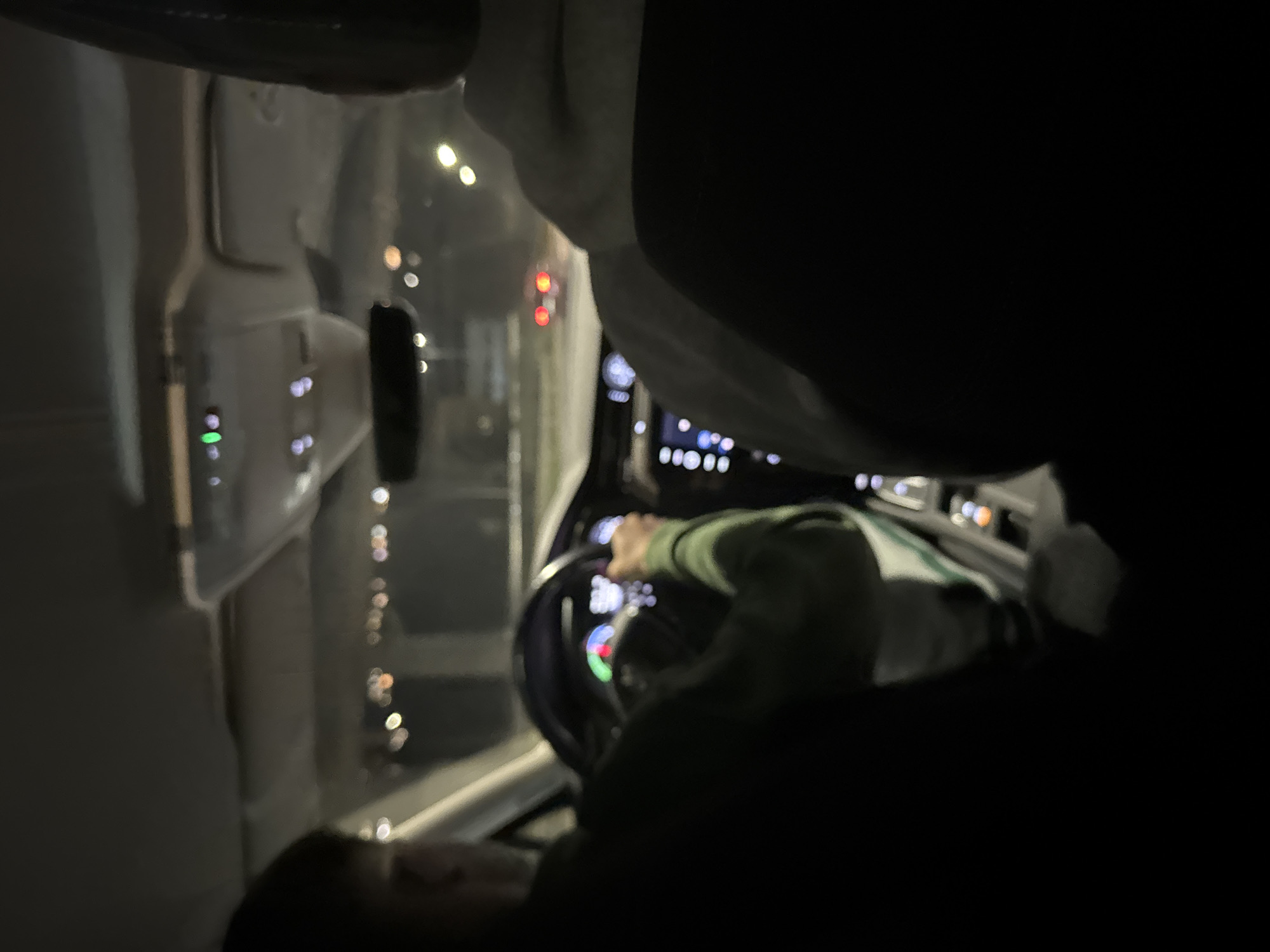 A low-light image taken from the rear passenger compartment of a vehicle depicts the interior and exterior elements during nighttime in Veliko Tarnovo, Bulgaria