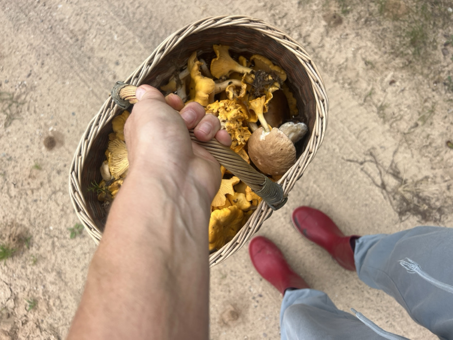 - "A high-angle view captures a person's upper body from the waist down, holding a woven wicker basket filled with freshly gathered mushrooms, located in the city of Strigailiškis, Lithuania" by FM-9alGY2, licensed under CC BY 4.0