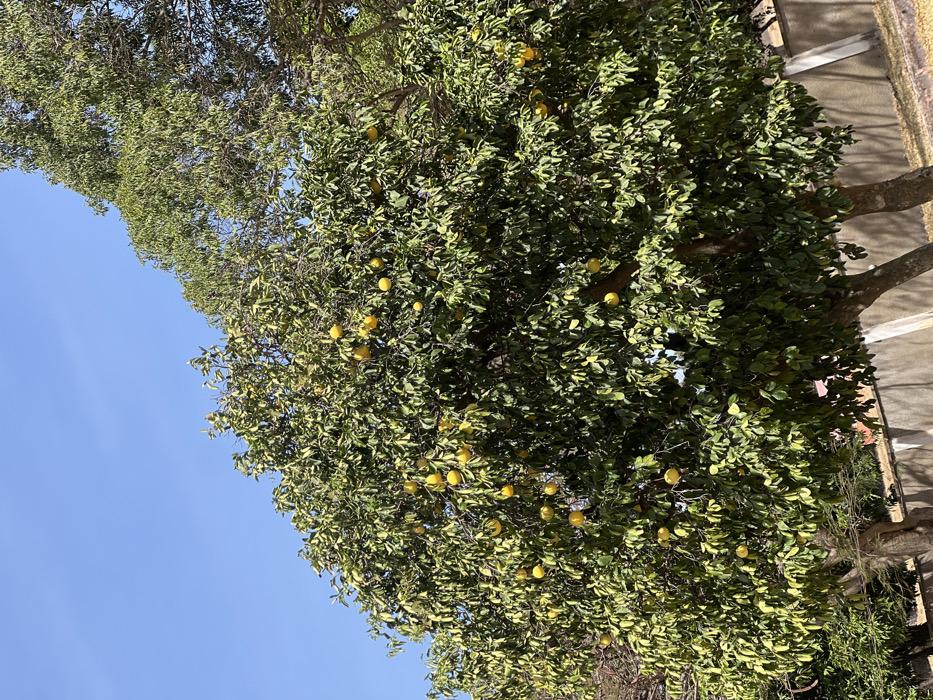 This image captures a sunny outdoor scene in Jos, Nigeria. The central subject is a large, dense tree characterized by abundant green foliage and numerous spherical, yellow fruits, consistent with ripe grapefruits or large oranges, visible throughout its canopy. The upper left portion of the frame features a clear, bright blue sky. Partial views of other tree trunks and foliage are present to the left and right of the main tree. In the lower background, a light-colored concrete wall with vertical divisions stretches horizontally. The ground beneath the trees appears dry and light brown. No individuals or specific identifying street markers are present in the frame.