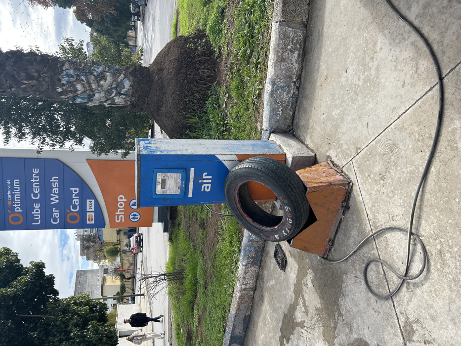 The image displays a ground-level view of a gas station area in Fez, Morocco, under an overcast sky. In the immediate foreground, a black tire, with visible red "GOODYEAR" lettering on its sidewall, is propped on a rusted, orange-brown, trapezoidal metal stand. Directly behind this setup is a blue and white air pump station, labeled "air," featuring a digital display and an integrated hose, part of which is coiled on the grey concrete pavement. Adjacent to the air pump stands a tall, vertical blue and orange totem sign, advertising "Optimum Carburants" and listing services including "Lube Centre," "Car Wash," "O’Card," and a "Shop" with restroom icons, along with Mastercard and Visa logos. To the right of the sign, a large palm tree rises from a patch of green, unkempt grass, its lower trunk and extensive root system forming a distinct mound. A low concrete curb, painted with blue and white accents, separates the paved area from the grassy median. In the mid-ground, two individuals are visible walking on a sidewalk to the left, one in light attire and the other in dark clothing. Further back, a red car drives on a street, with residential or commercial buildings and additional trees lining the thoroughfare. The concrete pavement in the foreground exhibits various stains and cracks.
