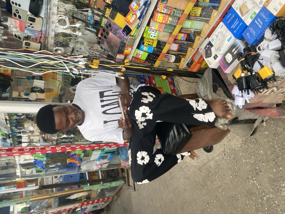 A young adult male, of dark complexion and short, dark hair, is seated on a dark upholstered stool with a wooden base, looking down at a silver-colored smartphone held horizontally in both hands. He is smiling faintly. He wears a white short-sleeved t-shirt with the word "VLONE" printed in black capital letters across the chest, and black trousers adorned with white, irregularly shaped floral patterns. His feet are bare. The scene depicts an outdoor or open-fronted electronics stall, commonly found in market areas of Accra, Ghana, such as Circle (Kwame Nkrumah Interchange) or Tip-Toe Lane. To the man's right, a vertical display stand holds numerous mobile phone accessories, including charging cables of various colors (white, black, yellow, green, blue) hanging from hooks, and rows of older model feature phones and various smartphone cases. Below this, a table displays boxed items, including power adapters, chargers, and cables, with some items individually packaged. In the background to the left, through a glass display cabinet, more electronic accessories and a blurred figure of another individual are visible. The ground is a light-colored, speckled concrete or tiled surface.
