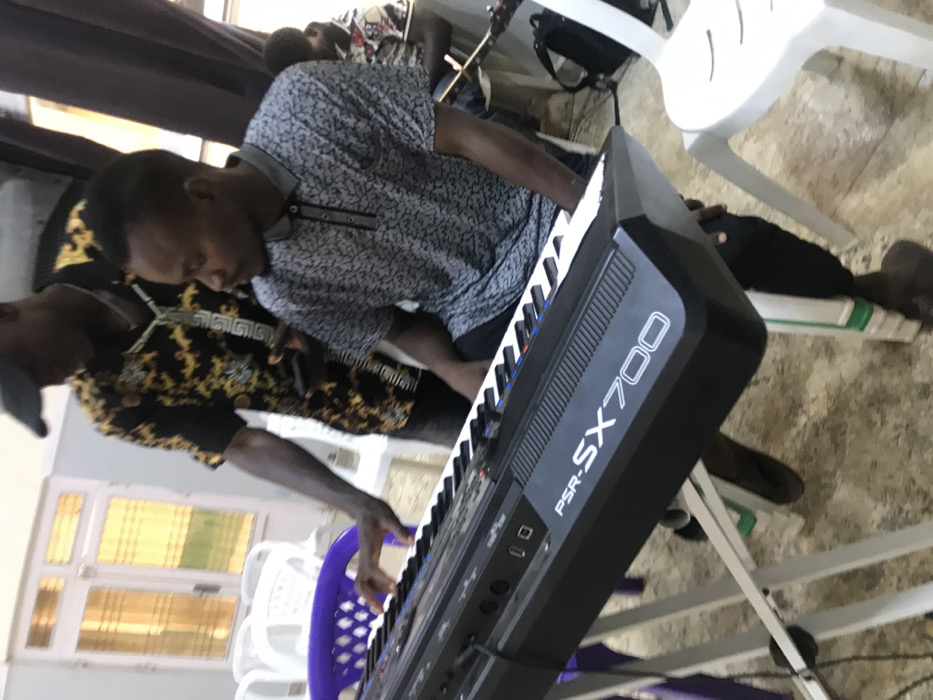 In an indoor setting within Jos, Nigeria, a teaching or collaborative music session is underway