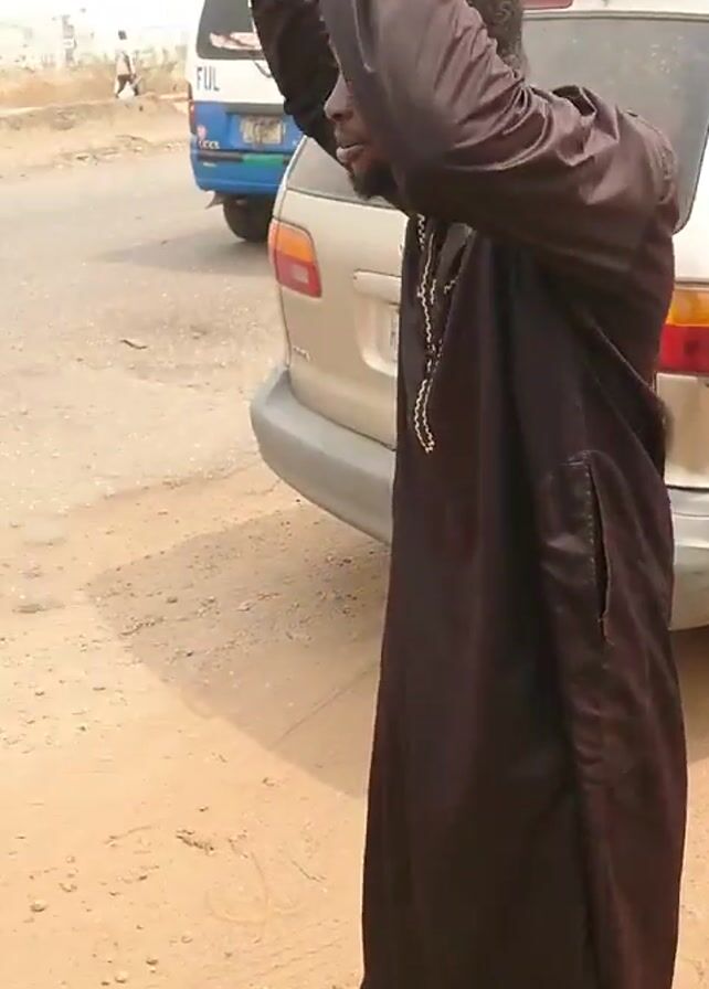 two men standing near a road. In the first shot, a man in a black robe is gesturing with his left hand. The background includes a tan van and a blue van. In the second shot, the camera pans across a road with concrete barriers and a motorcycle lying on the ground. The road surface is rough and cracked. In the third shot, a man wearing a gray polo shirt and a white and green baseball cap looks towards the road. In the final shot, the camera focuses on the road with the concrete barriers and the motorcycle. Buildings are visible in the distance. The sky is overcast.