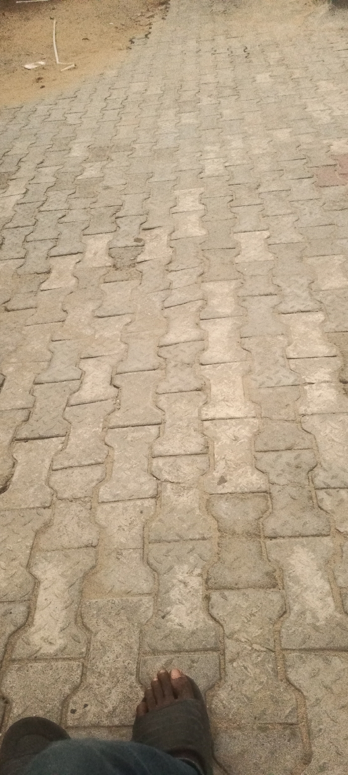 A close-up perspective focuses on a paved walkway of gray, interlocked concrete blocks stretching into the distance. The blocks feature a distinctive dumbbell shape. The path is marked with subtle variations in color and texture, suggesting wear and age. In the lower portion of the image, a foot clad in a dark sandal is visible, belonging to someone presumably standing on the path. The top of the photo shows sandy soil with a white object.