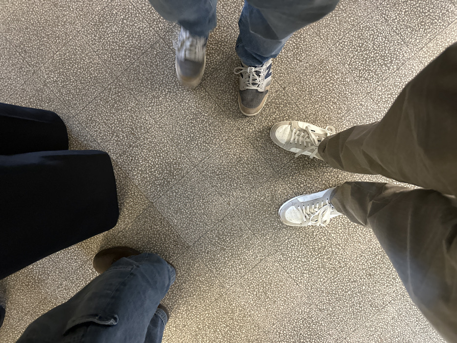 The scene depicts an overhead view of four individuals' lower legs and feet on a speckled light gray terrazzo floor with a faint grid pattern