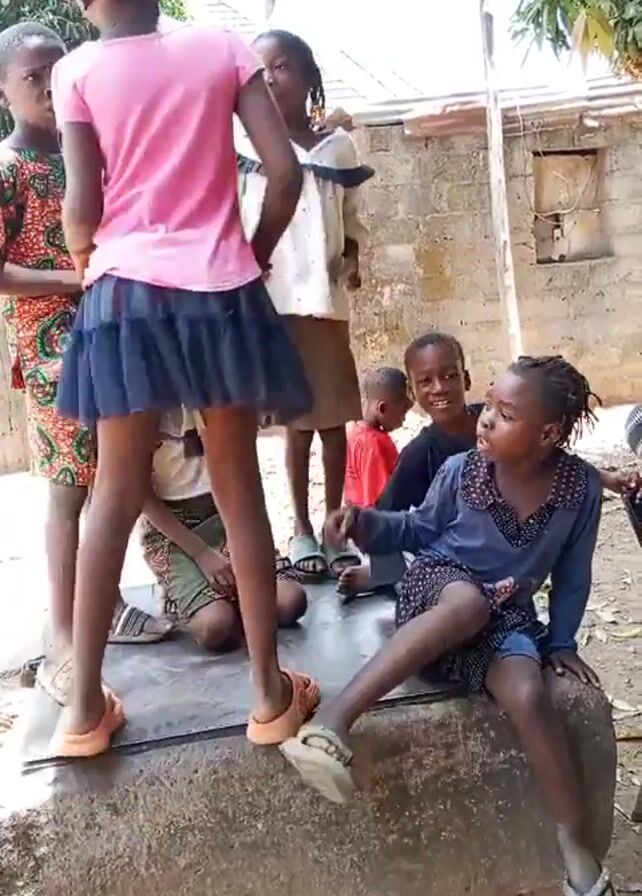 Several children, mostly girls, are gathered outdoors. The girls are wearing dresses and casual clothes. One girl in a pink shirt and blue tutu is standing on a concrete structure. Another girl is sitting on the structure, interacting with her. Other children are standing around, watching and smiling. The background includes a brick structure, trees, and foliage, suggesting a residential area. There is laughter and chatter, indicating a playful and social interaction among the children.