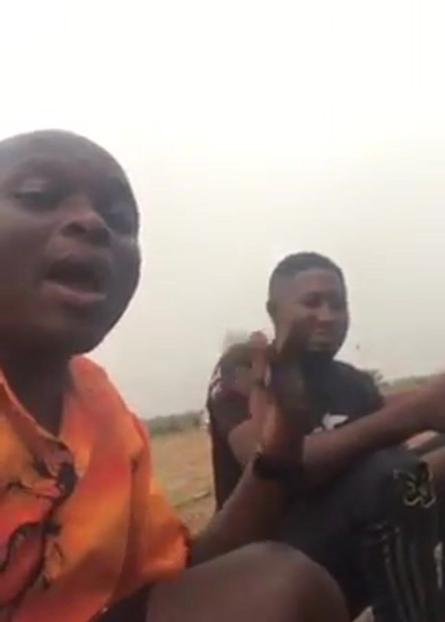 Two dark-skinned men are sitting outside. The man in the foreground is wearing an orange and yellow shirt with a buttoned collar, and he is speaking to the camera. He gestures with his right hand. The man behind him is wearing a black t-shirt and black pants with a white stripe. He gestures with his left hand. The sky is overcast and the ground is dry.