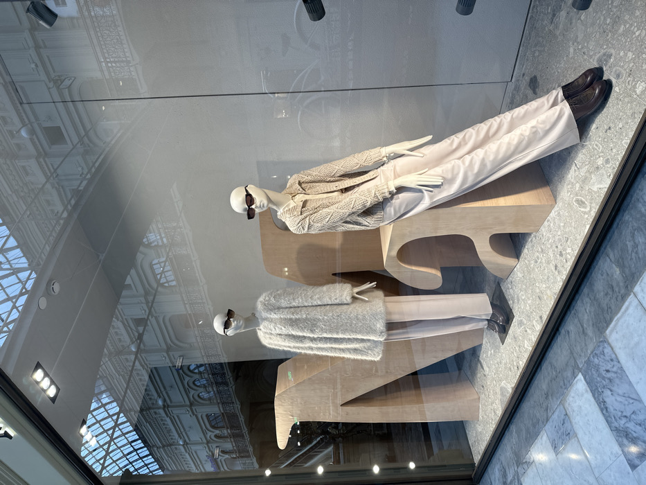 This image depicts a retail display window located within the GUM (State Department Store) in Moscow, Russia